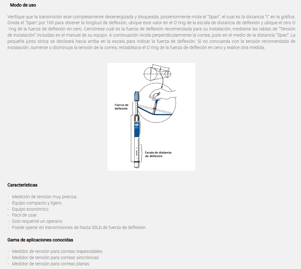 Esta es una herramienta, de uso rápido y sencillo, para obtener una precisa medición de tensión en correas de industriales Su principio de funcionamiento para medir la tensión se basa en la deflexión de la correa. Incluye los adaptadores para los diferentes perfiles del diente.